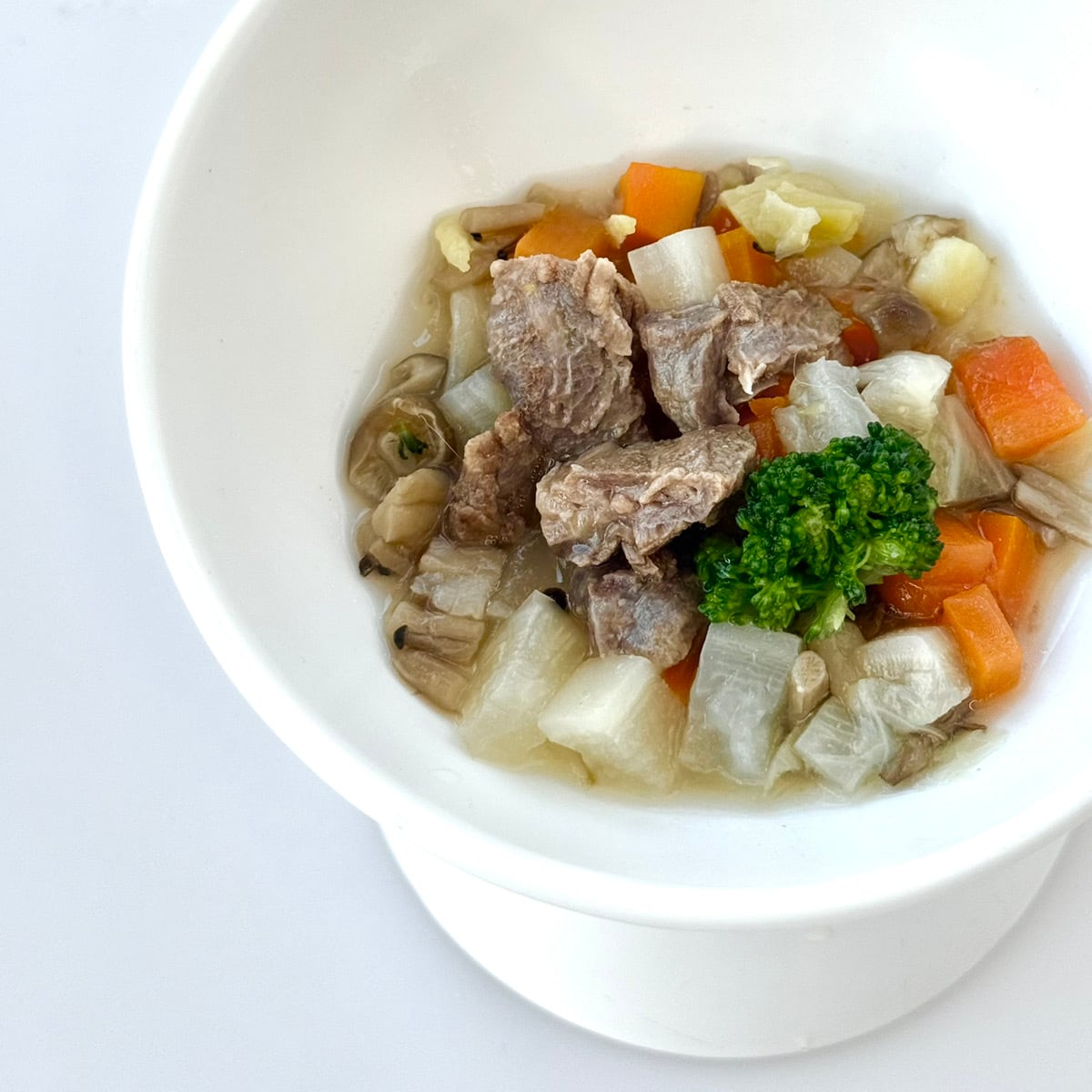 原材料 (100%表示):スープ(トマト、トマトピューレ)、豚肉(ロース、ヒレ)、白菜、ブロッコリー、しめじ、人参、小松菜、里芋、セロリ、パルメザンチーズ、パセリ