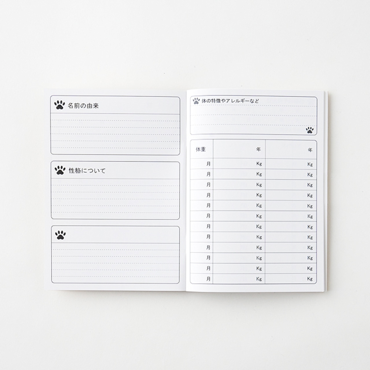 毎日のごはん、うんち、お散歩など毎日の記録やお出かけやイベントなど1か月を見開きで管理できます。